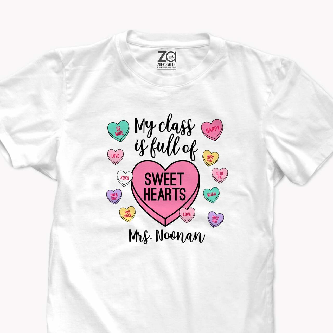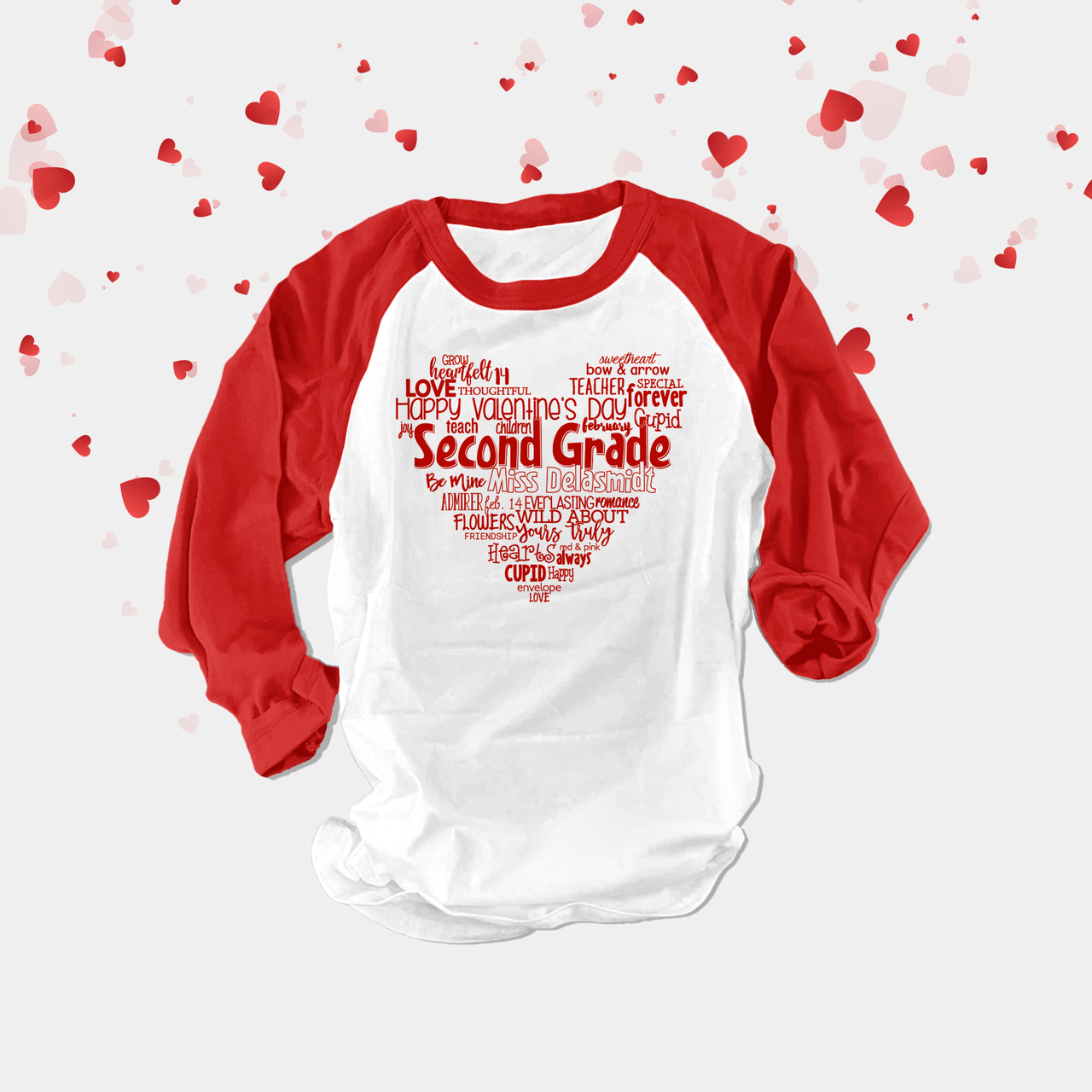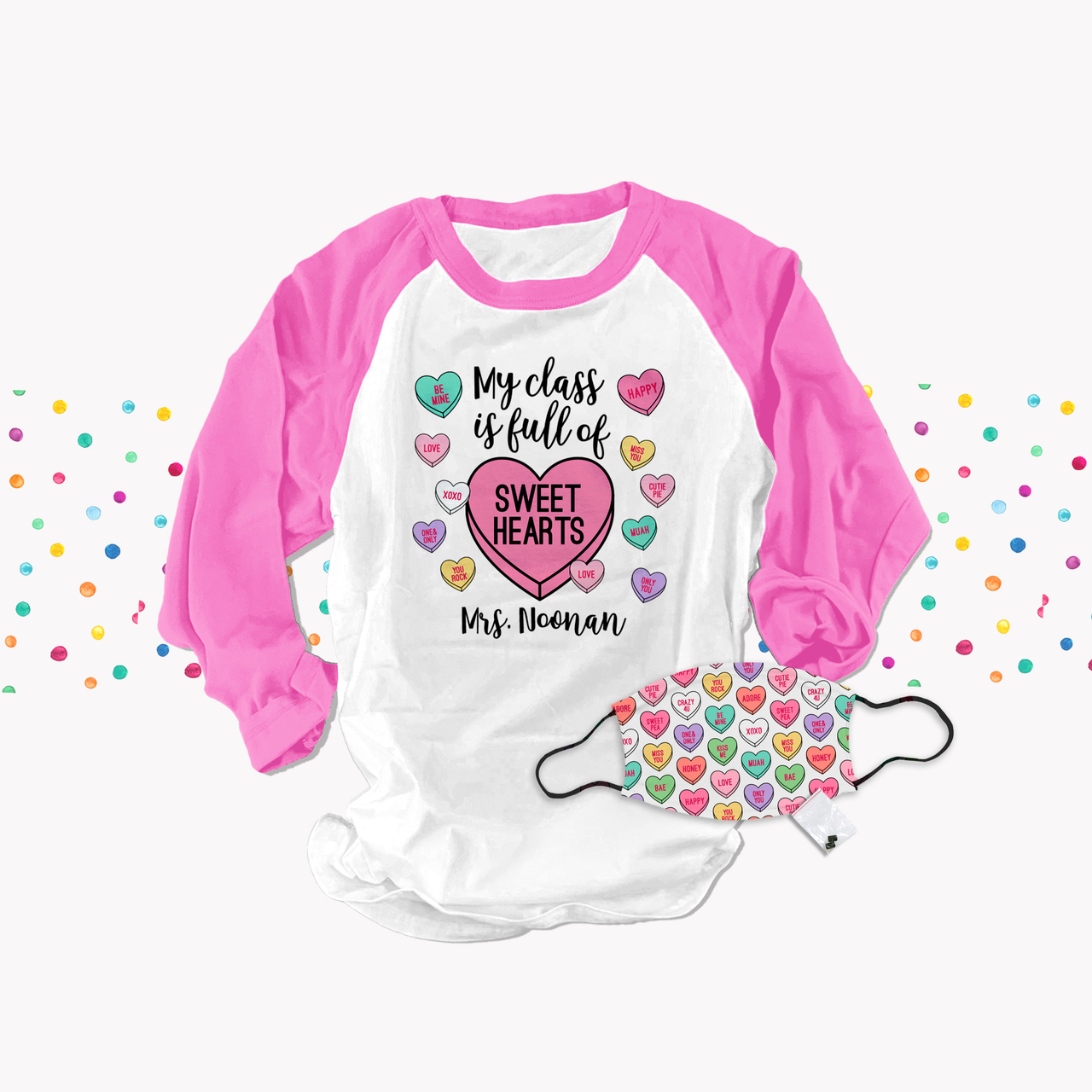 Our teacher friends love our holiday shirts and Valentine's Day is no exception! Our " My class is full of Sweethearts" unisex raglan style shirt with matching mask add on option is this year's top seller! It comes in a variety of sleeve colors including pink, red, navy, and black. The sweetheart design can also be made on a unisex crew neck t-shrt or a women's v-neck top. And, of course, our "Valentine Heart" personalized raglan shirt continues to be a teacher favorite.