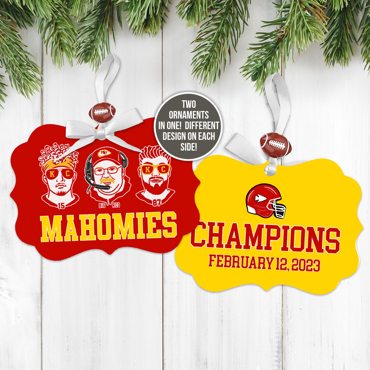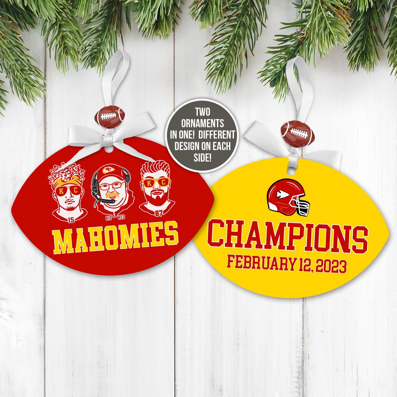 Recently every mention of the famed Kansas City Chiefs football team has been about the Kelce-Swift romance! However, the team is most notably the winner of the 1968, 20202, and 2023 Super Bowls! To commemorate this most recent Super Bowl victory Zoey has created a special keepsake ornament. The ornament features on one side the funny lovable trio of Mahomes, Reid, and Kelce with the wording "MAHOMIES", and the flip side showcases the team's Super Bowl Champions achievement in 2023! This aluminum ornament measures approximately 4" across and 2.75" high and comes complete with a charming bow featuring a football bead. Another option is the football shaped ornament with the same "Mahomies" design. Our custom designed and produced in house football ornament measures approximately 4" across and 2.75" high.