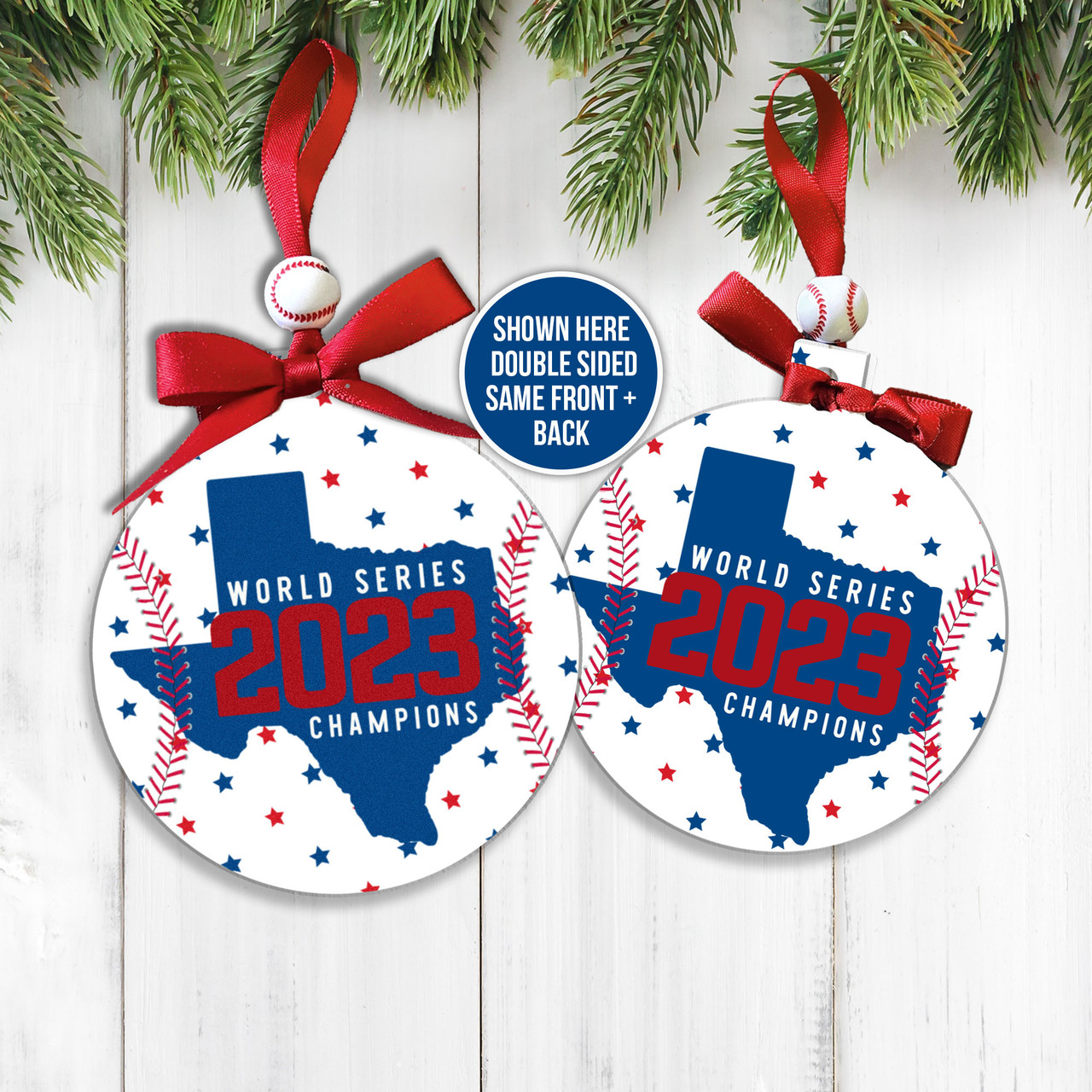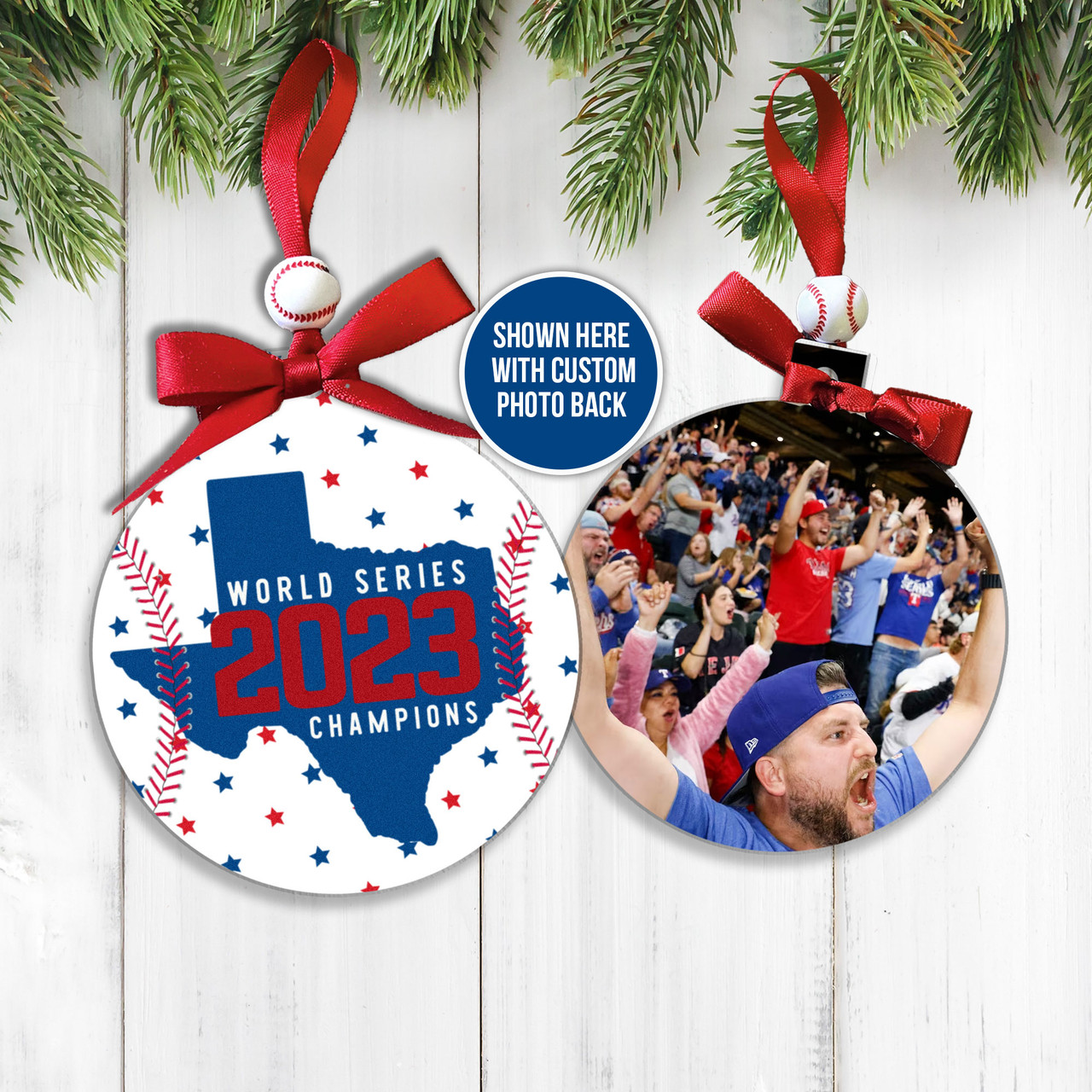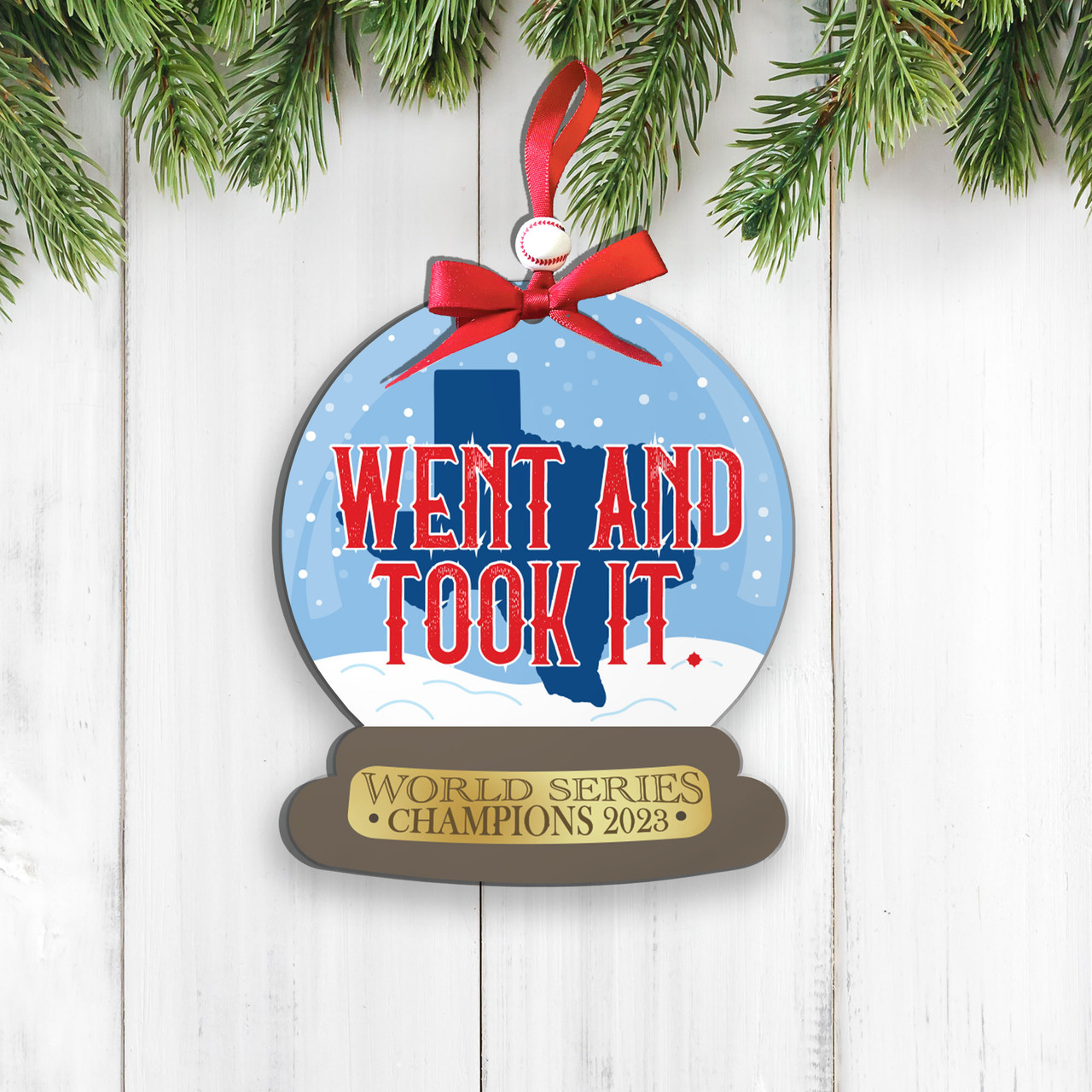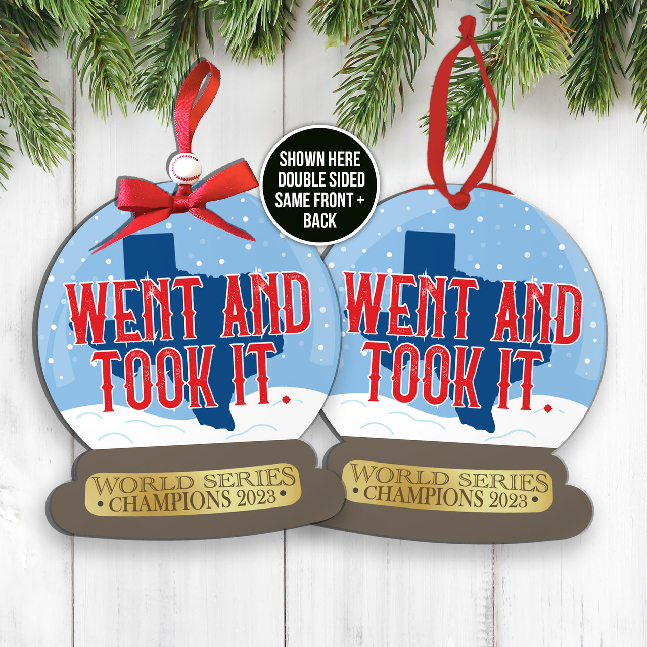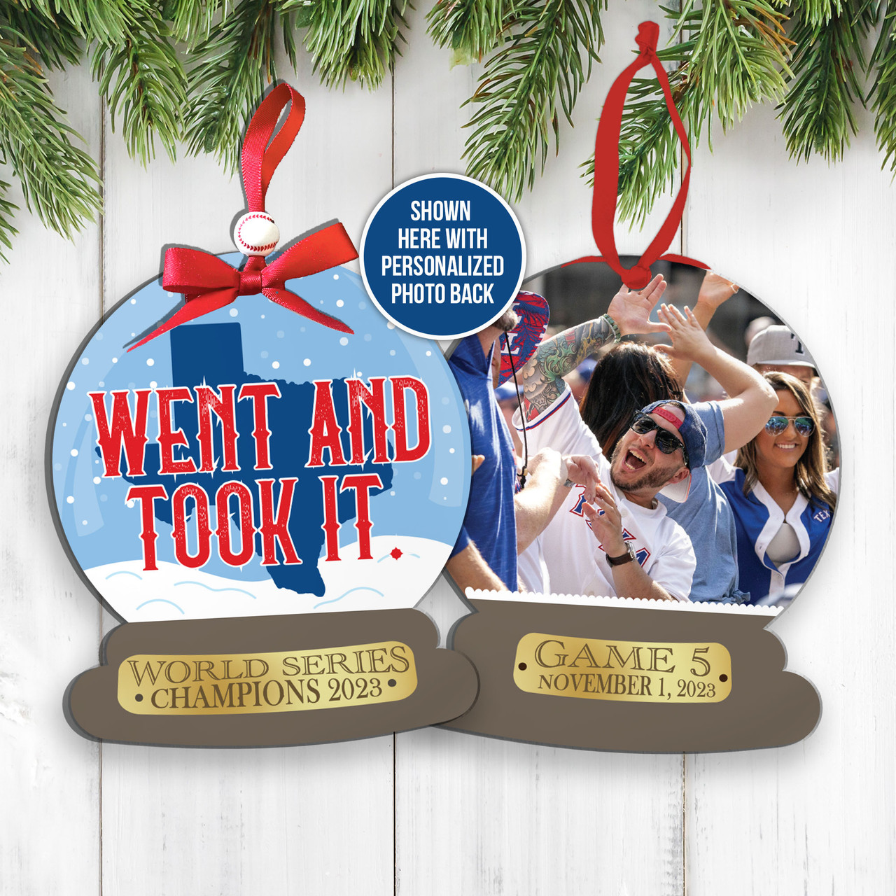 Although the St. Louis Cardinals baseball team did not make the playoffs this past season, baseball fans enjoyed the competitive play of the Texas Rangers and the Arizona Diamondbacks. The Rangers won the championship title in five games! Commemorate the Rangers championship season with our "World Series 2023 Champions" classic 3.2" diameter aluminum ornament featuring the state of Texas. There is also an option to add your personal photo to the flip side of this ornament. There is also a "Went And Took It" Christmasy snow globe design keepsake ornament. Another great gift for Texas Ranger fans!