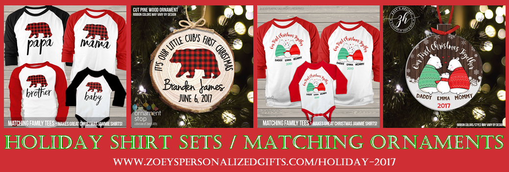 Lastly, family photos with everyone dressed in festive pajamas are all the rage. While Zoey's Attic doesn't currently offer pajama bottoms we do have comfy holidays tops that make the best Christmas jammie family shirts. Bundles for a family of three or four are available on our website and additional shirts can be added to any set if needed. We've even made family shirts for the grandparents, aunts, uncles, cousins, and family friends too. Our most sought after family shirt set this Christmas season has been the " Red Plaid Bear" matching set for four followed closely by the "First Christmas Family Bear" shirt set for three. And, don't forget the adorably sweet matching ornaments!